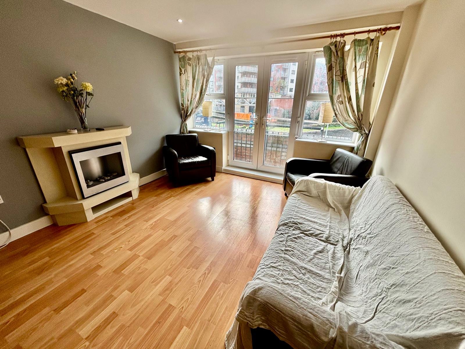 There is a good sized open plan lounge/diner with with a Juliette balcony opening out over the local canal network offereing views of the water and mored boats.